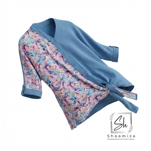 شومیز طرح گل چاپی سفید - آبی آسمانی